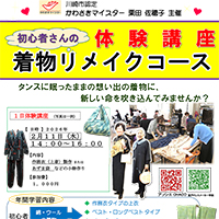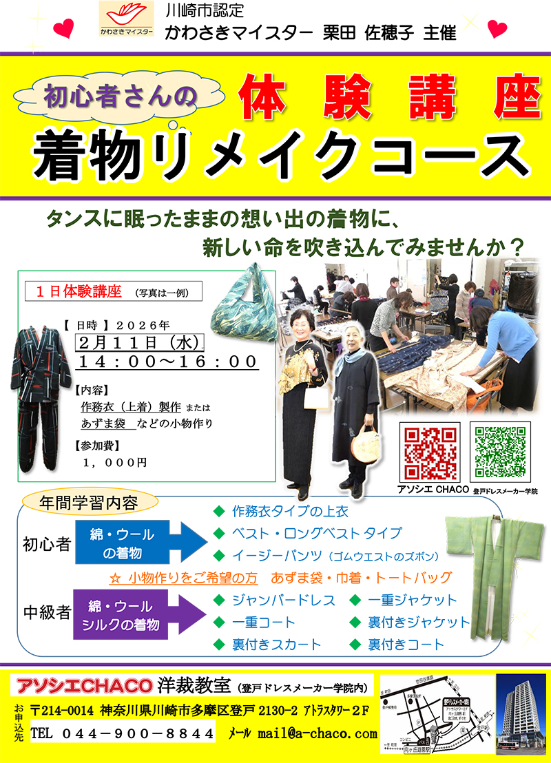 「タンスにしまったままの思い出の着物を蘇らせてみませんか。 着物を「ズボン」や「ベスト」にリメイクする方法を学ぶことができます。 超!初心者さんは「トートバッグ or 和風のきんちゃく」作りを楽しみます。